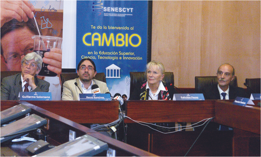 Picture taken during the signing ceremony at SENESCYT (Quito, Ecuador) on 12 July 2011. From left to right: Guillermo Solórzano, Minister for Coordination of Knowledge and Human Talent, Rene Ramirez Gallegos, National Secretary for Higher Education, Science and Technology - SENECYT, Felicitas Pauss and Jose Salicio from CERN.