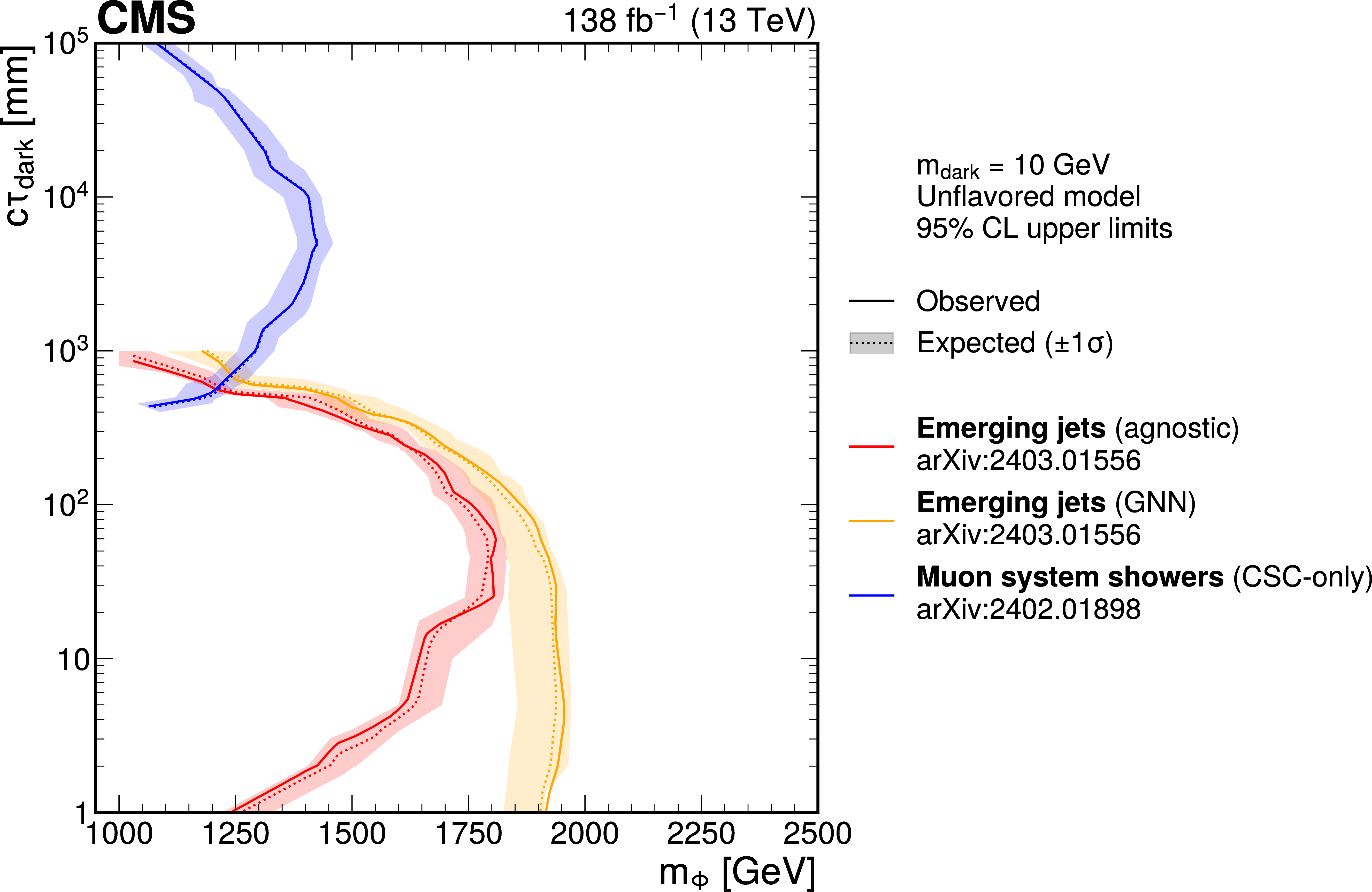 95% CL exclusion limits from the track-based [arXiv:2403.01556] and muon detector shower-based [arXiv:2402.01898] searches for pair production of a bifundamental mediator that decays to a jet and an emerging jet, for mπdark = 10 GeV and various choices of Xdark masses and πdark lifetimes, in the unflavored model.