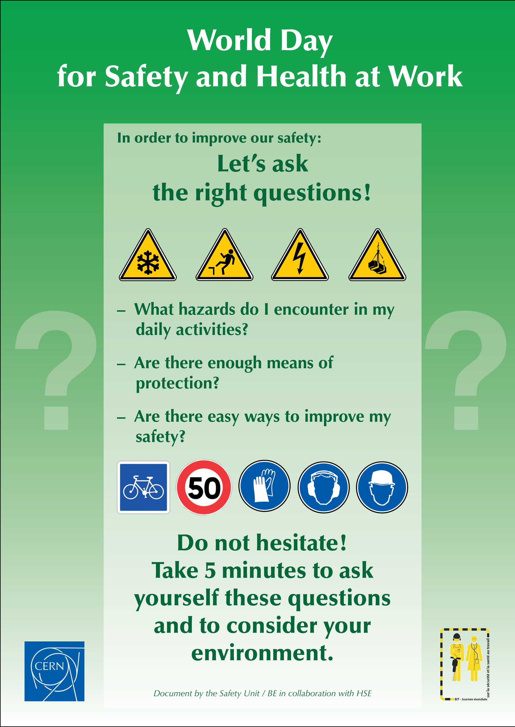 Since 2003, the International Labour Organization and the World Health Organization have been organising an annual event on 28 April called “World Day for Safety and Health at Work.” This year, CERN is taking part for the first time with campaigns organised by the Safety Unit of the BE Department and by the HSE Unit.