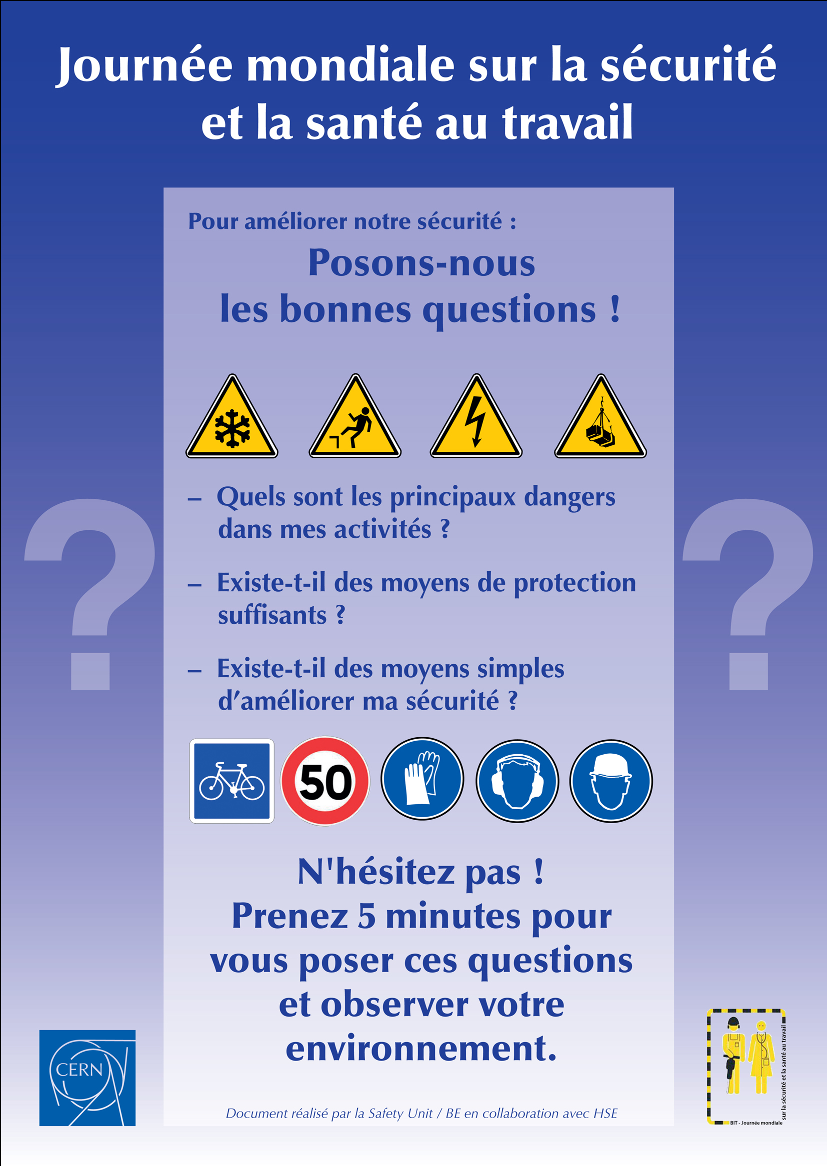 Chaque 28 avril depuis 2003, l’Organisation internationale du travail et l’Organisation mondiale de la santé organisent la Journée mondiale sur la sécurité et la santé au travail. Pour la première fois cette année, le CERN marque cet évènement avec des initiatives coordonnées par la Safety Unit du département BE et l’unité HSE.