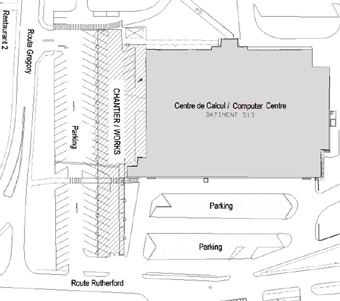 Dans le cadre des aménagements réalisés par la division IT pour relever le défi de l'informatique pour le LHC, une nouvelle sous-station est en construction au Centre de Calcul. Les travaux de génie civil pour cette sous-station vont démarrer à la mi-août et durer jusqu'en mars 2004. Durant cette période, l'accès au parking des Merisiers, entre le bât.513 (Centre de Calcul) et le bât.504 (Restaurant n°2) sera restreint. Vous verrez sur le plan ci-joint la zone de chantier et l'emplacement des parkings de remplacement.