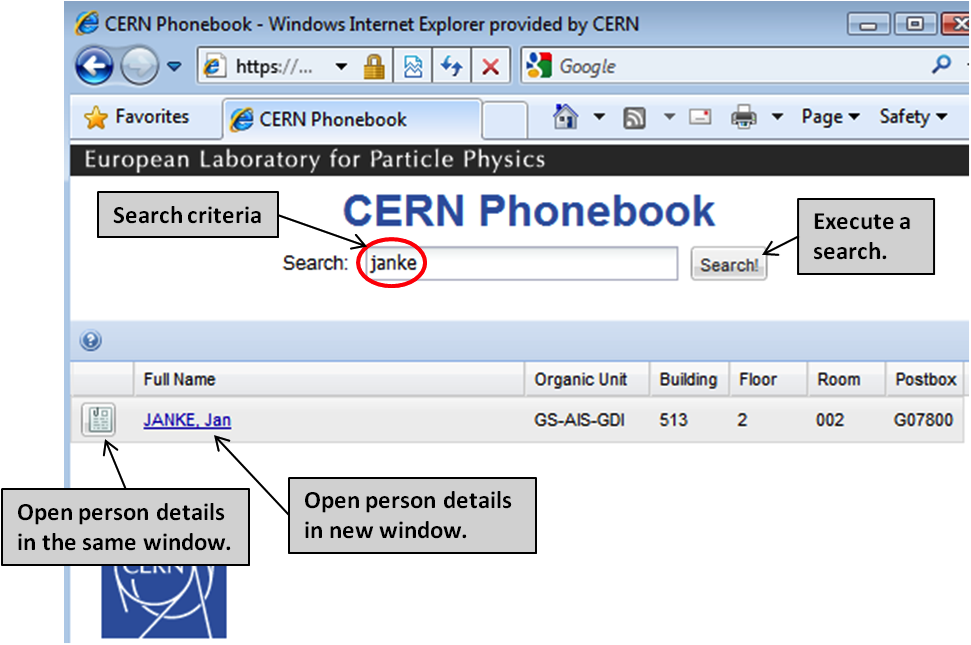The CERN Phonebook was designed to be as easy as possible to use. It therefore offers a very simple user interface consisting of a search field and a ‘Search’ button. As with modern Internet search engines, typing a few characters is enough to launch a search. For services, a link to the CERN Service Portal giving access to additional information like contact details and opening hours etc. will also be provided. In future versions, additional information will gradually become available through the Phonebook and, while the basic data will remain accessible to everyone, some of the more specific additions may only be visible to authenticated users.