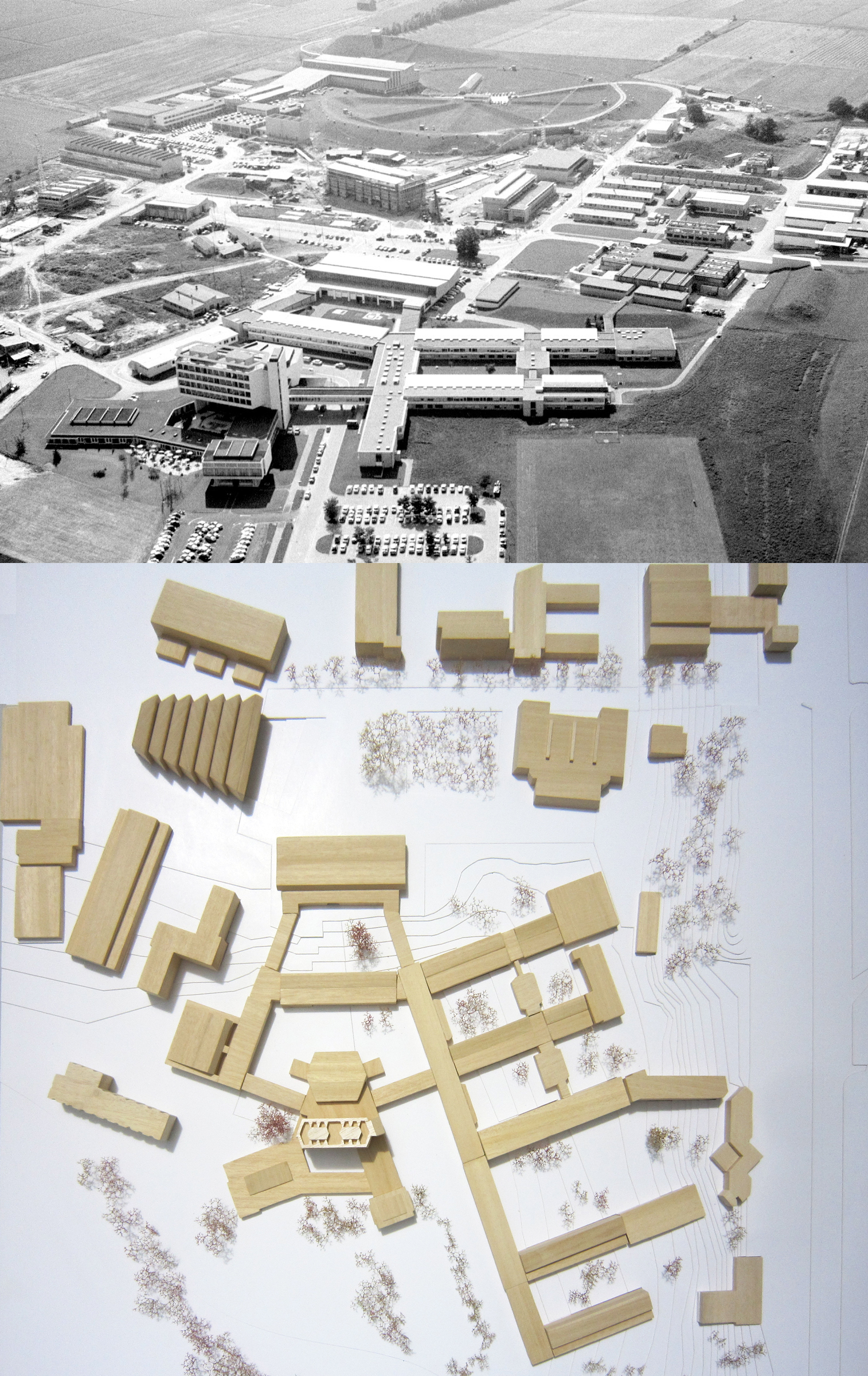 Top: Aerial vue of the CERN site in 1961 (CERN archive).