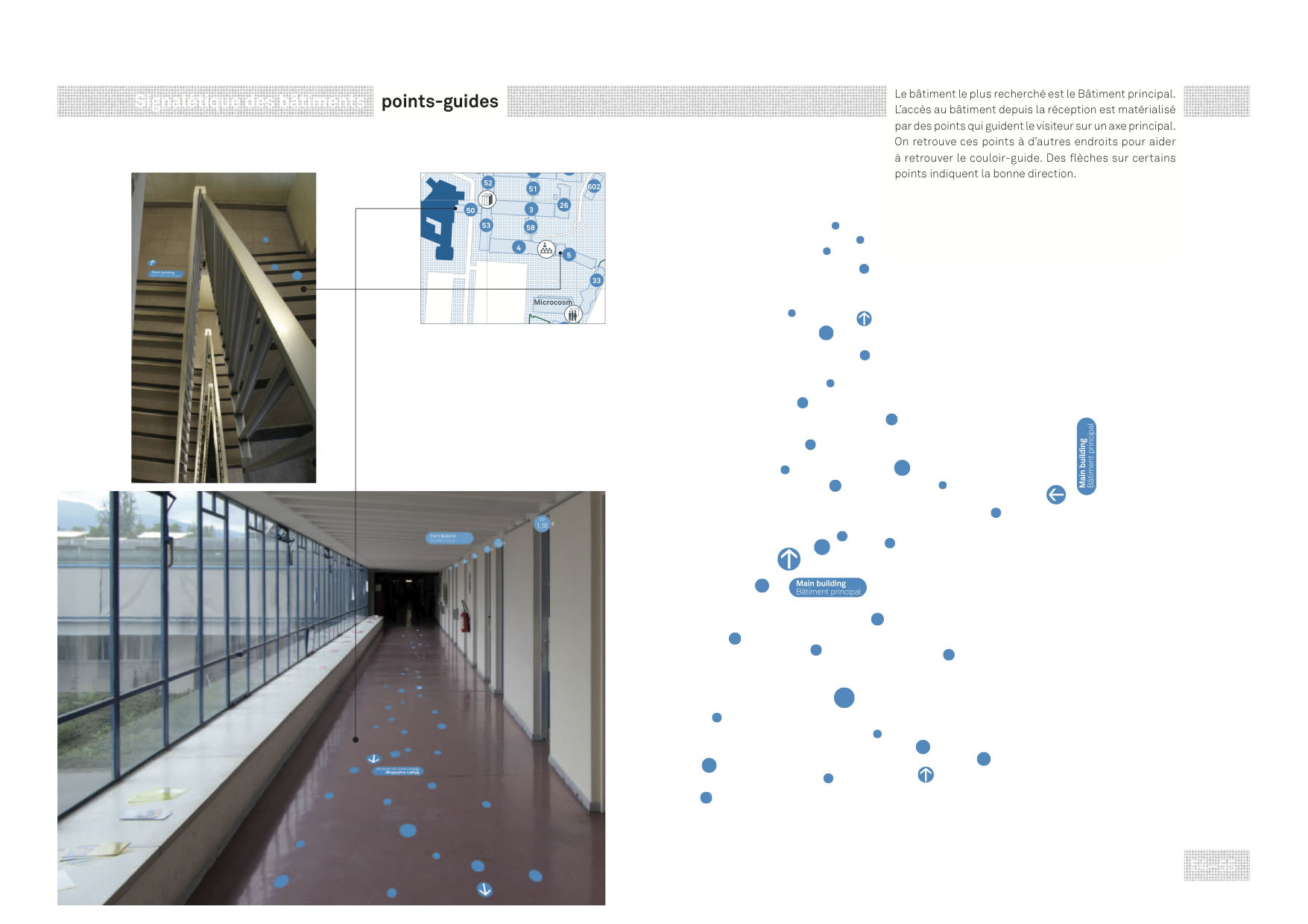 Chacun de ces éléments renvoie à une nouvelle carte qui permet aux visiteurs de trouver les bâtiments plus facilement. « J’ai beaucoup travaillé sur le plan du CERN, car il est indispensable pour trouver son chemin, explique Larissa. Je l’ai rendu plus lisible et plus clair en divisant Meyrin en cinq zones et en adoptant un code de couleur pour celles-ci suivant leur fonction. » Elle a également proposé de remplacer la ligne noire qui guide les visiteurs de la réception au bâtiment principal par un « faisceau » de petites particules bleues et de flèches peintes sur le sol permettant aux visiteurs de ne pas se perdre en chemin.