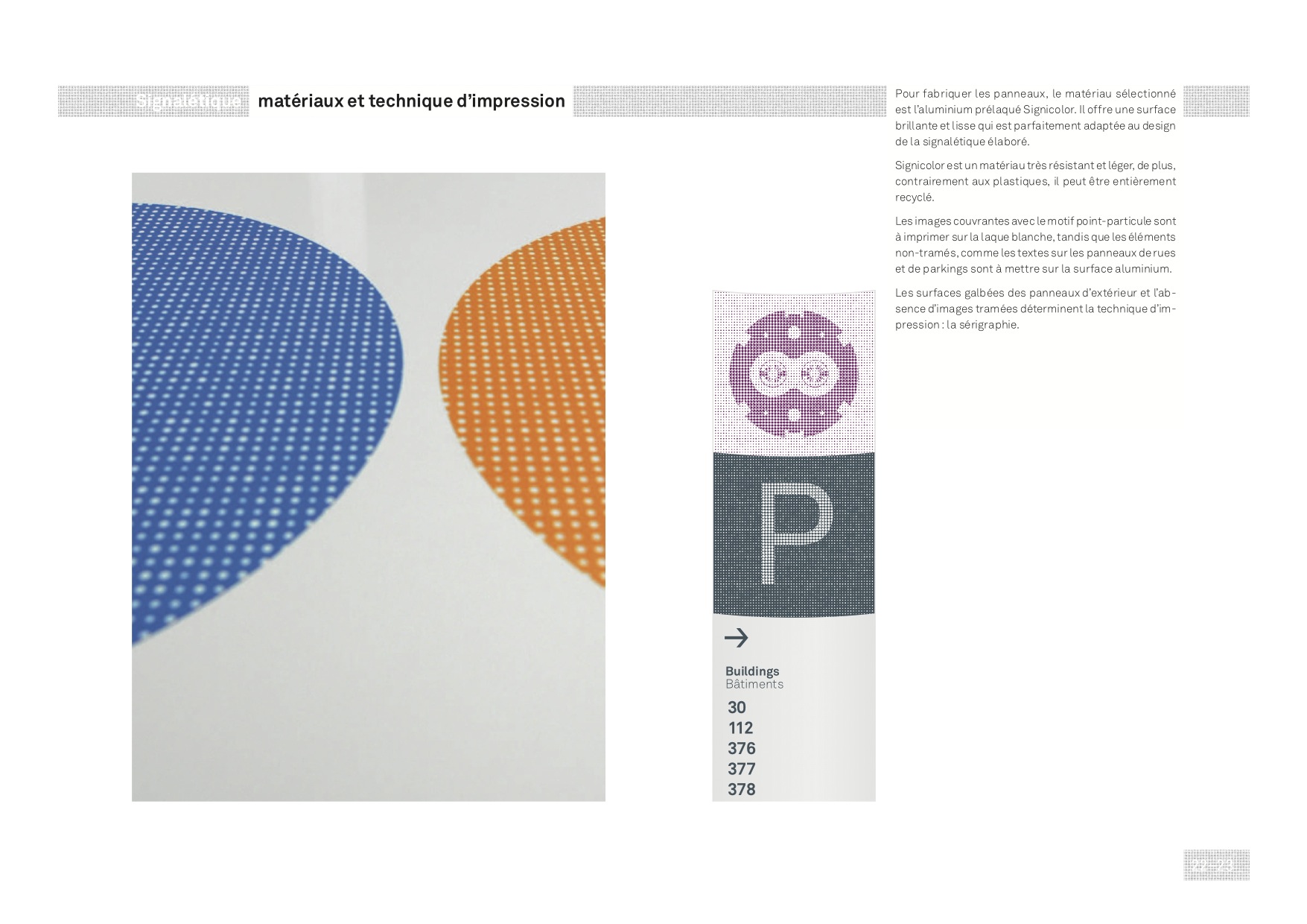 « En graphisme, la plus petite entité est le point visible, j’ai donc décidé de faire de la particule un point pour rendre visible et plus humain quelque chose d’invisible, explique-t-elle. Ce sont les particules fondamentales étudiées au CERN qui sont à l’origine des structures qui nous entourent ; j’ai donc conçu un motif composé de points de différentes tailles comme élément de base pour chaque élément graphique. » Ce motif sert à former l’arrière-plan de chacun des éléments du système de repérage que Larissa a proposé de faire ériger sur les sites de Meyrin et Prévessin.