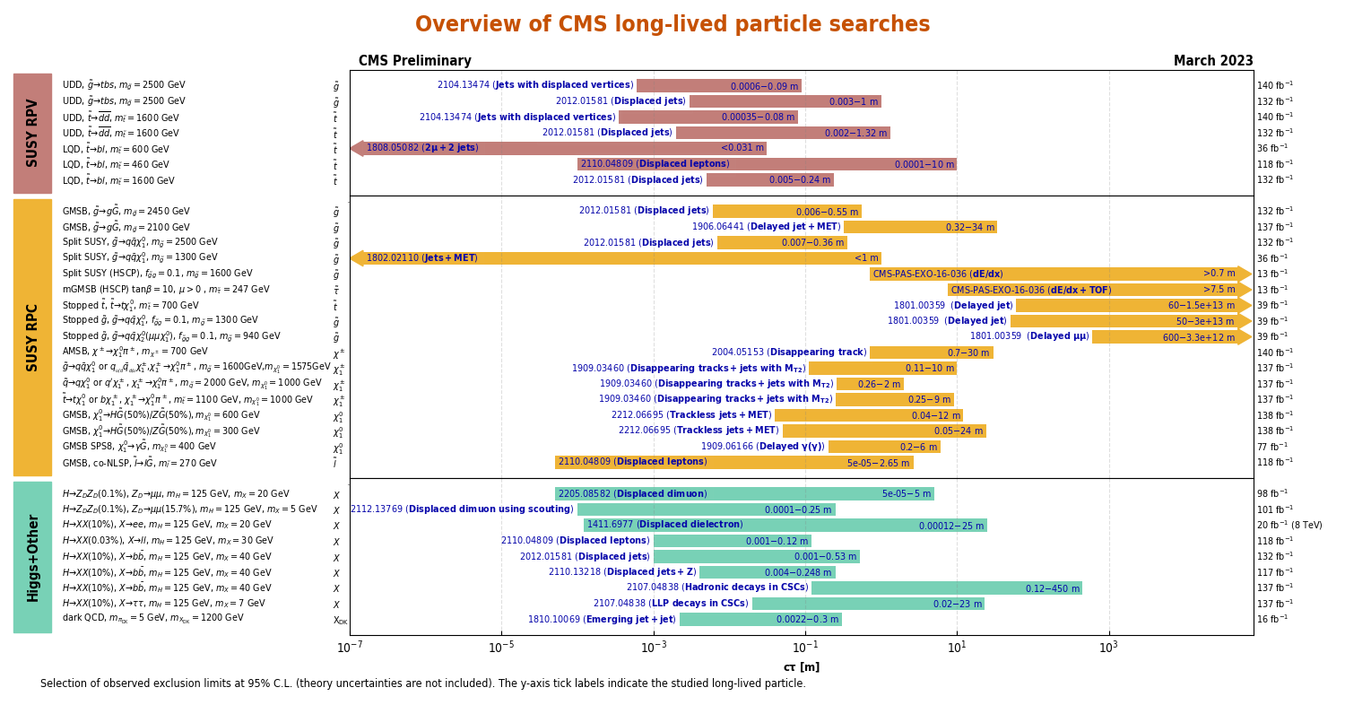A bar chart representing the lifetime reach of CMS long-lived particle analyses for a selected set of new physics phenomena.