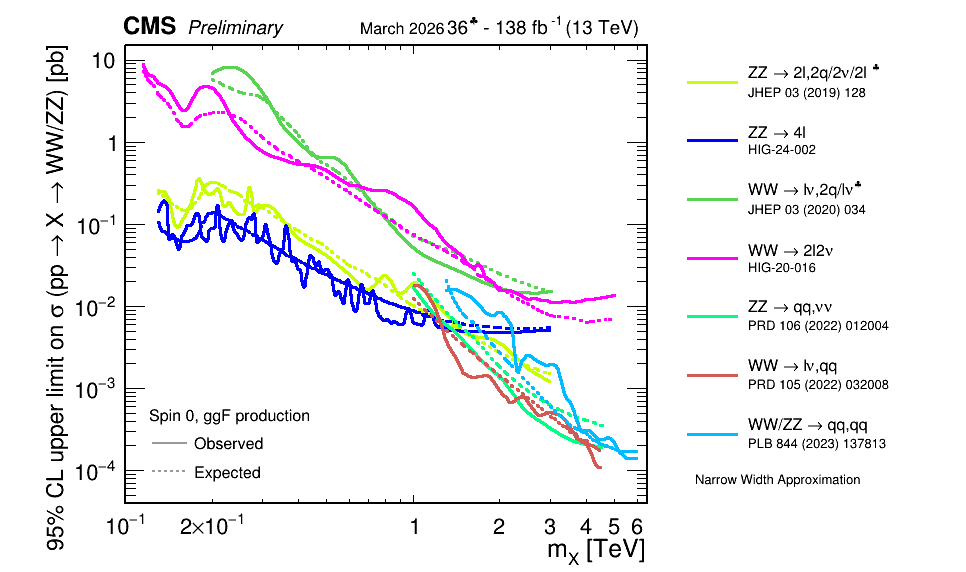 Observed and expected 95% CL upper limits on the product of the production cross section times BR(VV) of a spin-0 resonance (X) versus its mass obtained by different analyses.