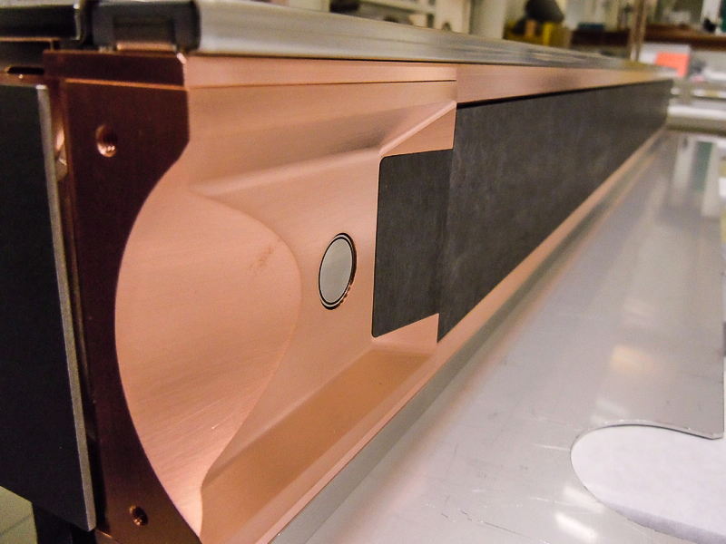 The internal structure of a new LHC collimator featuring (see red arrow) one of the beam position monitor's pickups.