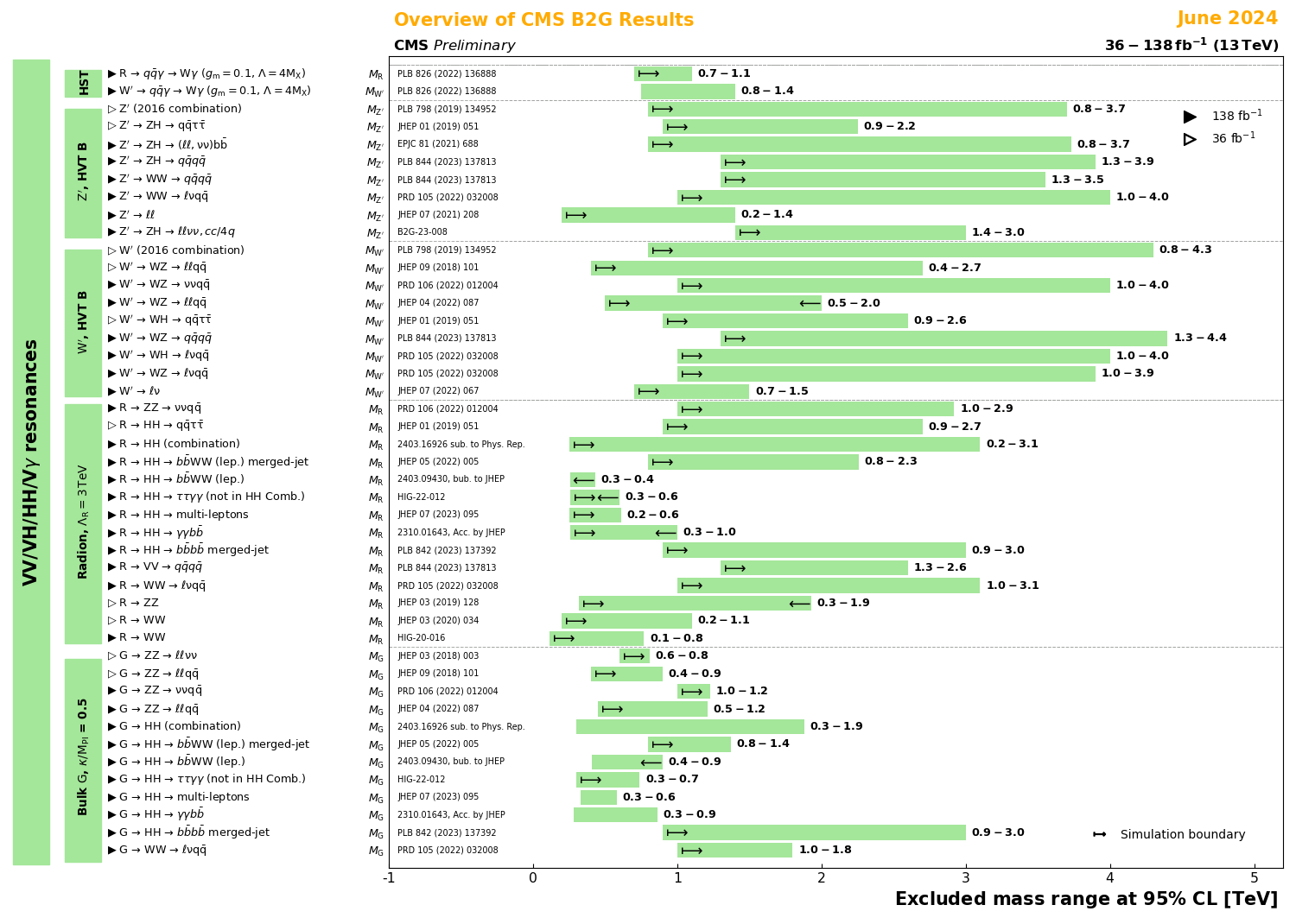 Collective summary of the various Resonances decaying to diboson final states searches with 95% CL lower mass limits of the predicted new particle.