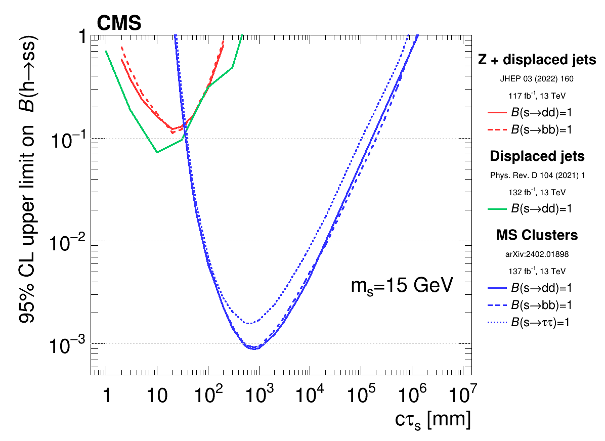 The 95% CL observed exclusion limit from different CMS hadronic long-lived particle analyses on the branching fraction of the standard model higgs boson, h, to two neutral long-lived scalars, s, shown as a function of the scalar’s proper lifetime. The scalar mass is assumed to be 15 GeV.