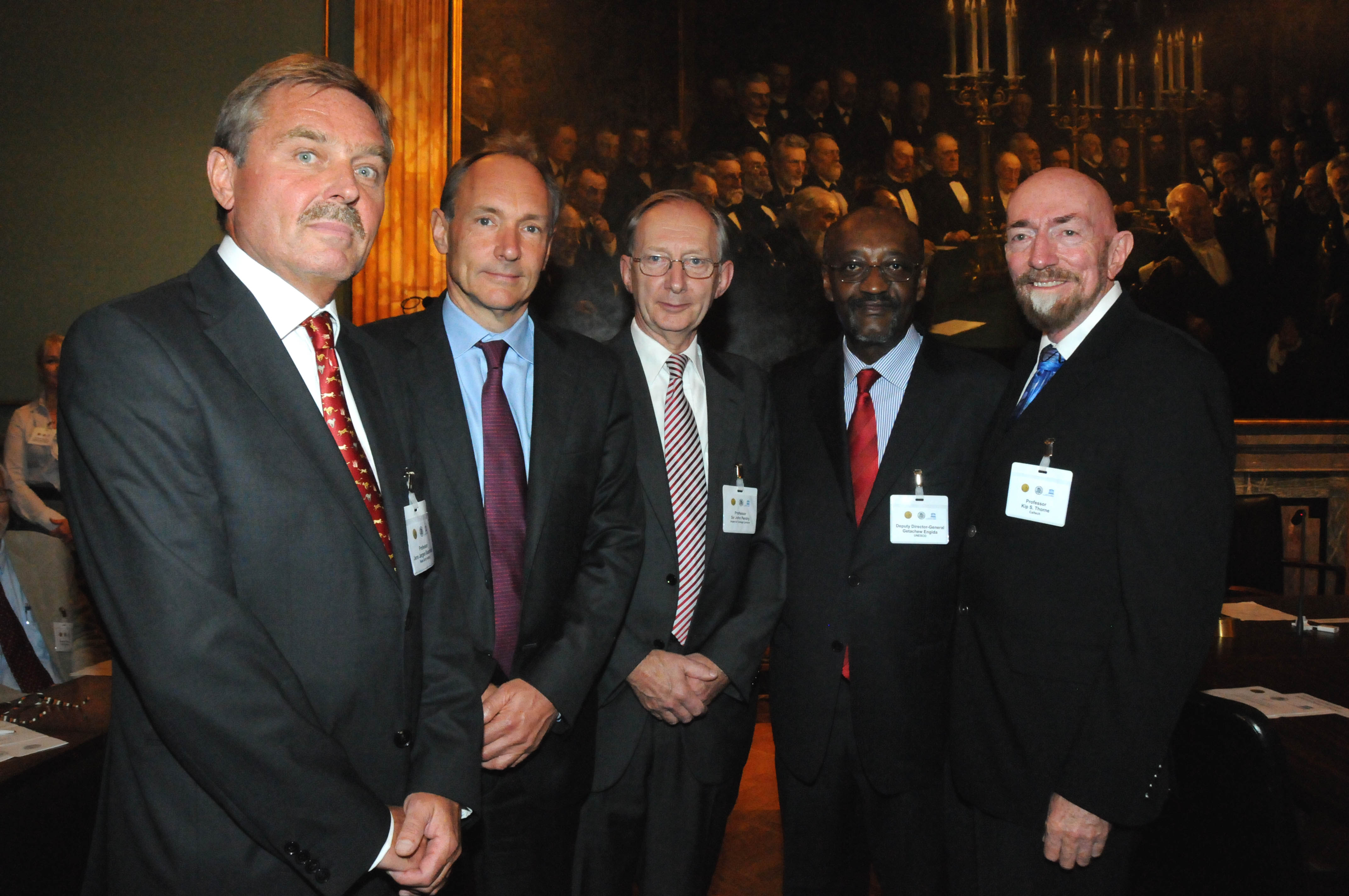 Prof. Jens Jørgen Gaardhøje (Chair of the Medal Selection Committee and President of the Science Committee of the Danish National Commission for UNESCO and a member of the ALICE collaboration at CERN) with Prof. Sir Tim Berners-Lee (now W3C, MIT; Boston, formerly CERN), Prof. Sir John Pendry (Imperial College, London), Deputy Director-General of UNESCO, Mr. Getachew Engida, and Prof. Kip S. Thorne (Caltech, Pasadena), at the UNESCO Awards Ceremony. © Hasse Ferrold