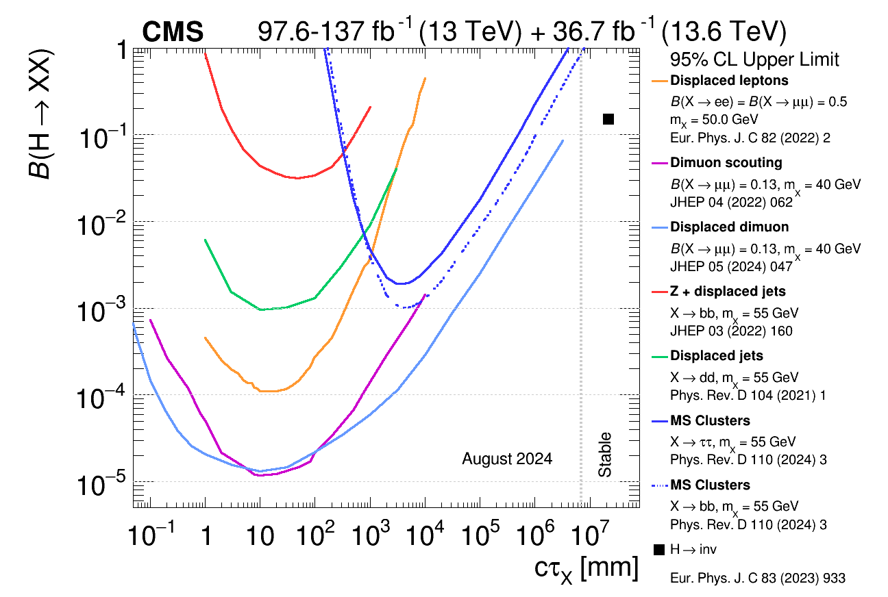 The 95% CL observed exclusion limit from different CMS high mass (>= 40 GeV) long-lived particle analyses on the branching fraction of the standard model higgs boson, h, to two neutral long-lived particles, X, shown as a function of the long-lived particle’s proper lifetime. The Dimuon scouting and Displaced dimuon exclusions assume X decays according to JHEP 02 (2015) 157, while the Displaced leptons analysis assumes X->ee or µµ with a 50% branching fraction for each decay mode. The exclusions shown for Z+displaced jets, Displaced jets, and Hadronic MS analyses assume X decays with 100% branching fraction to bb, dd, tautau, respectively.