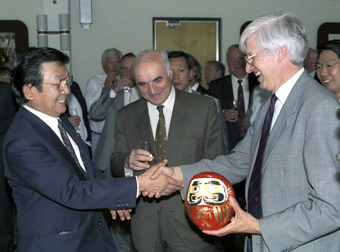 Il en est de même pour le Japon, comme l'illustre cette photo prise en 1995, où Hubert Curien apparaît encadré par le Ministre de l'Education, des Sciences et de la Culture japonais, Kaoru Yosano, et le Directeur général du CERN, Christopher Llewellyn Smith. Lors de cette cérémonie marquant les débuts de la collaboration entre le CERN et le Japon, le Ministre japonais offre au Directeur général du CERN une poupée Daruma. Selon la tradition japonaise, un oeil est peint sur cette poupée en bois pour marquer le début de la réalisation du projet LHC, le second doit être dessiné lors de son achèvement. Il est triste que Hubert Curien ne puisse être présent lorsque le second oeil sera peint, après le début d'exploitation du LHC en 2007.