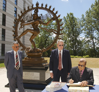 Cette statue, offerte par l'Inde, honore une collaboration de longue date entre le Laboratoire et l'Inde, qui a débuté dans les années 60 et n'a aujourd'hui rien perdu de sa vigueur. Elle a été inaugurée par le Directeur général, M. Robert Aymar, Son Excellence M. K. M. Chandrasekhar, Ambassadeur (WTO-Genève) et M. Anil Kakodkar, Président du Commissariat indien à l'Energie atomique et Secrétaire du Département de l'Energie atomique de l'Inde.