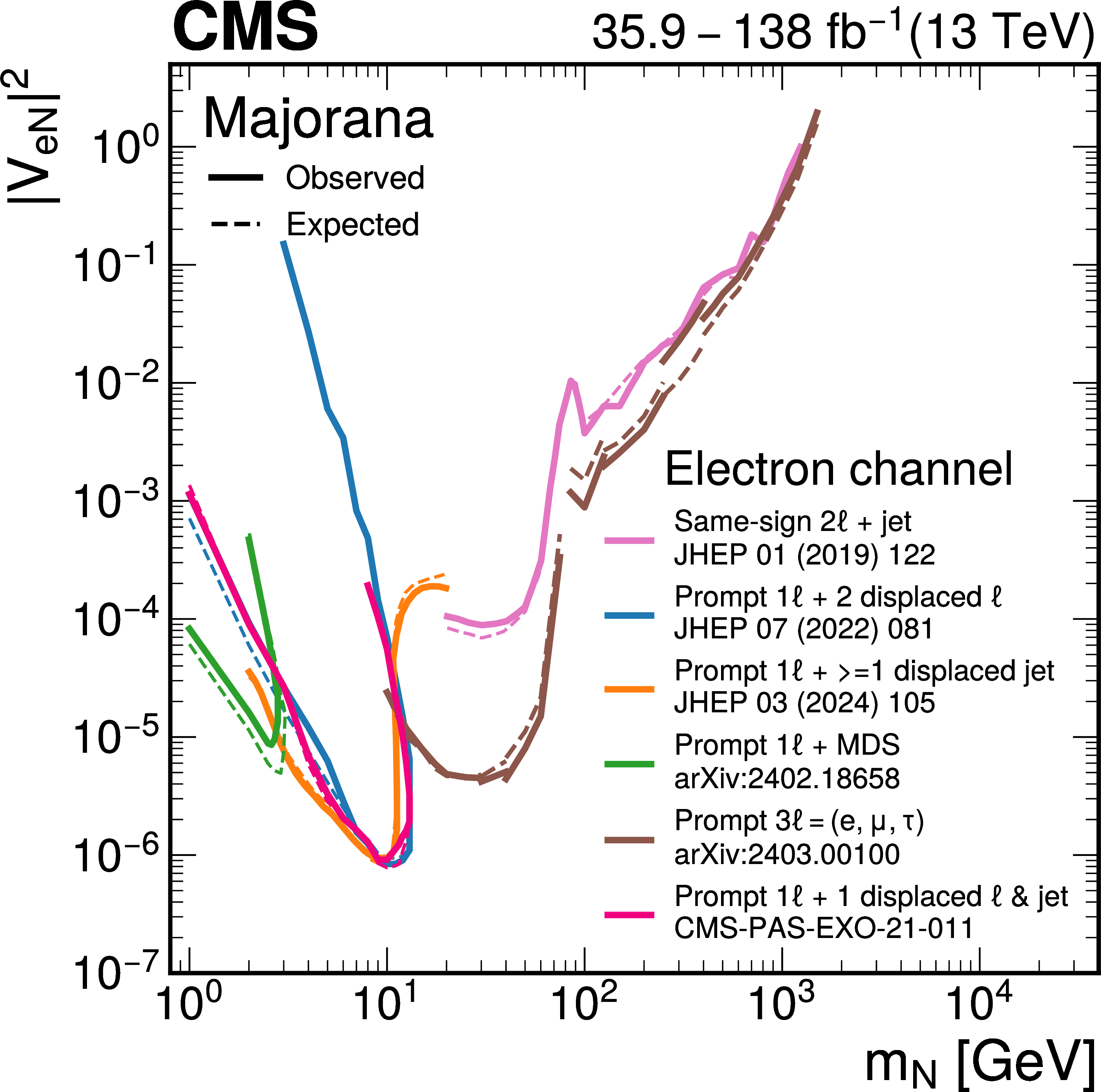 Summary of CMS searches for displaced Heavy Neutral Lepton (HNL), Majorana hypothesis, in the Type-I seesaw model (Electron Channel). Observed and expected limits at 95% confidence level on the mixing parameter squared as a function of the HNL mass (mN) are shown.