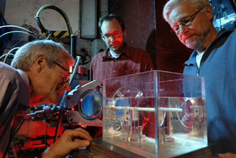 De gauche à droite: Michael Holzscheiter avec ses collaborateurs Niels Bassler et Helge Knudsen devant l'expérience ACE. Le faisceau de particules pénètre dans un tube de cellules au c?ur d'un récipient contenant une solution de glycérol et d'eau.