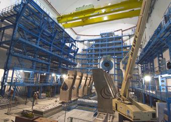 Le tonneau du détecteur ATLASreposera sur dix-huit pieds en acier inoxydable dans sa caverne située au point 1. Le système des pieds d'ATLAS supportera au total environ 6000 tonnes et donnera au détecteur la même inclinaison que celle de l'accélérateur LHC.