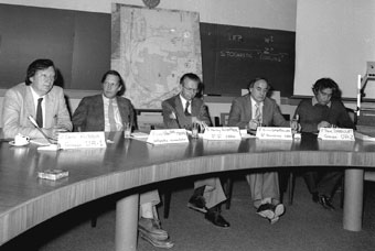 A press conference held at CERN on 25 January following the announcement of the discovery of the W boson. From left to right: Carlo Rubbia, spokesman of the UA-1 experiment, Simon van der Meer, inventor of stochastic cooling technology, Herwig Schopper, Director-General of CERN, Erwin Gabathuler, CERN Research Director, and Pierre Darriulat, spokesman of the UA-2 experiment.