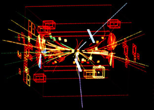 L'un des premiers événements révélant le Z enregistré par le détecteur UA-1 en 1983. Le Z se désintègre en une paire électron-positon dont les traces sont clairement visibles (les deux lignes droites, l'une partant vers le haut à droite et l'autre fusant vers le bas légèrement sur la gauche).
