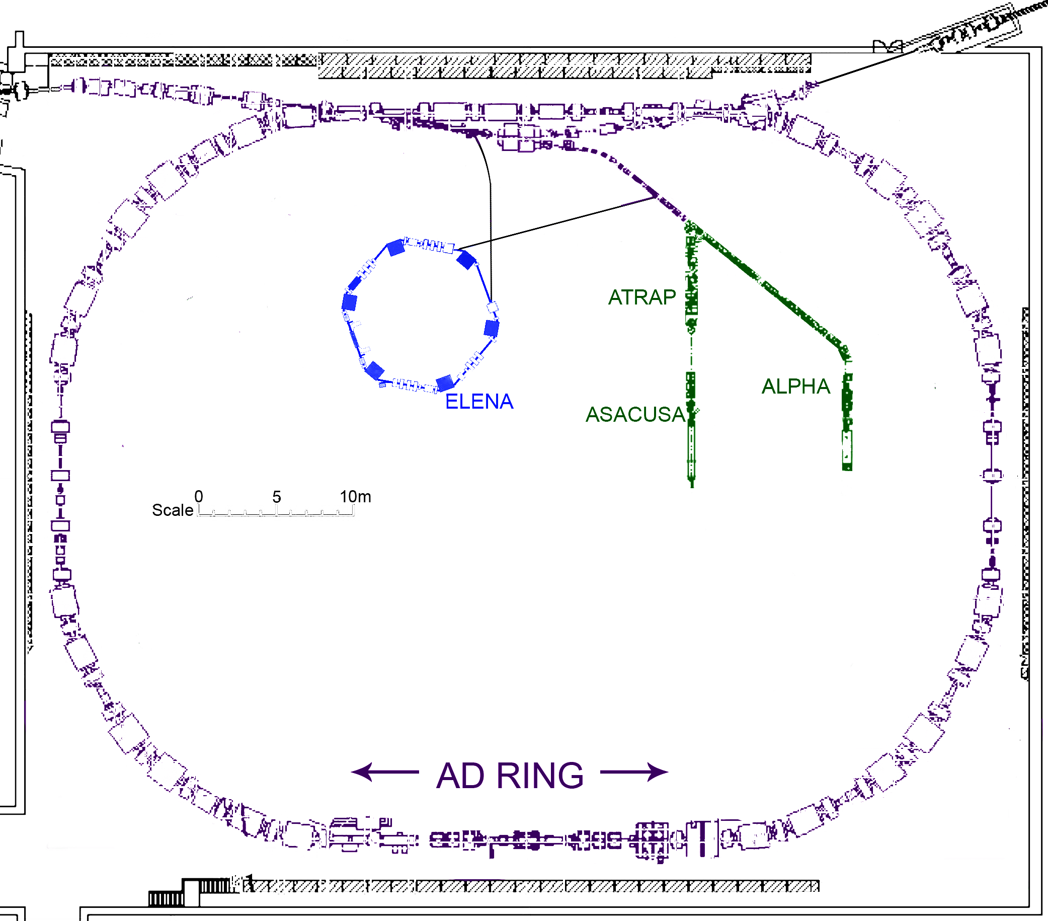 Plan du hall accueillant les expériences liées à l'AD : l'anneau décélérateur d'antiprotons AD (en violet) ; les expériences ALPHA, ASACUSA et ATRAP (en vert) ; et la nouvelle bague d'ELENA (en bleu). L'expérience ACE n'est pas représentée.