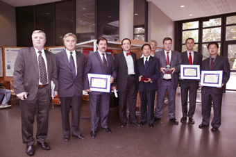 One award winner is Advanced Technology and Materials (ATM), a young, privately-held Chinese company headquartered in Beijing, an offspring of a previously state-supported network of research institutes specializing in materials science. ATM has emerged as a leader in advanced materials such as tungsten alloys and refractive metals. They won a contract with ALICE to produce a variety of complex absorber parts fabricated from a high-density tungsten alloy. These parts, totalling more than seven tonnes, are the heart of a finely-tuned muon filter which has the task of absorbing thousands of hadrons produced in each LHC lead-lead collision, while only minimally disturbing the tell-tale muons emitted from quark-gluon matter. These pieces, located in the centre of the 15-metre-long muon spectrometer, had to be built with sub-millimetre precision in complex, interlocking shapes surrounding the delicate beam pipe of the collider: a true example of a "Chinese puzzle". The company was honoured for their outstanding collaboration, innovative technology, and on-time and to-specification delivery.