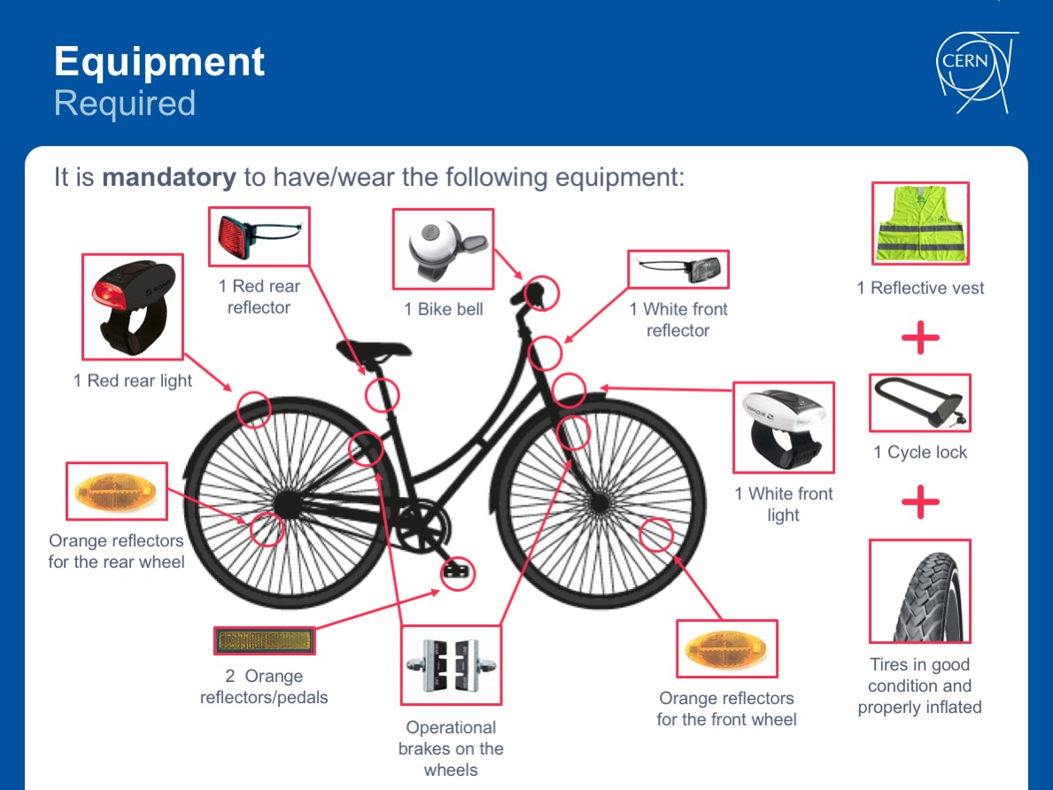 As a general rule, make sure you’re visible by using lights and reflectors, and wearing high-visibility clothing when you are out on your bike. Wear a helmet, and remember that you are subject to the same rules of the road as any other vehicle. Don’t forget there’s an online course in SIR on ‘Road traffic - bike riding’. It’s compulsory if you want to use a CERN bike, and freely available for anyone else.