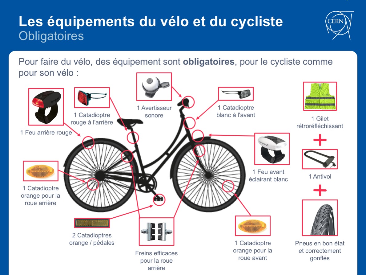 De manière générale, faites en sorte d'être visible : utilisez des lumières et des catadioptres, et portez des vêtements rétro-réfléchissants lorsque vous vous déplacez à vélo. Mettez un casque et souvenez-vous que vous êtes soumis aux mêmes règles de la circulation que les utilisateurs de n'importe quel autre véhicule. N’oubliez pas que le cours « Circulation routière - Rouler à vélo » est disponible sur l’application en ligne SIR. Il est obligatoire si vous souhaitez utiliser un vélo du CERN, mais peut être suivi par tous.