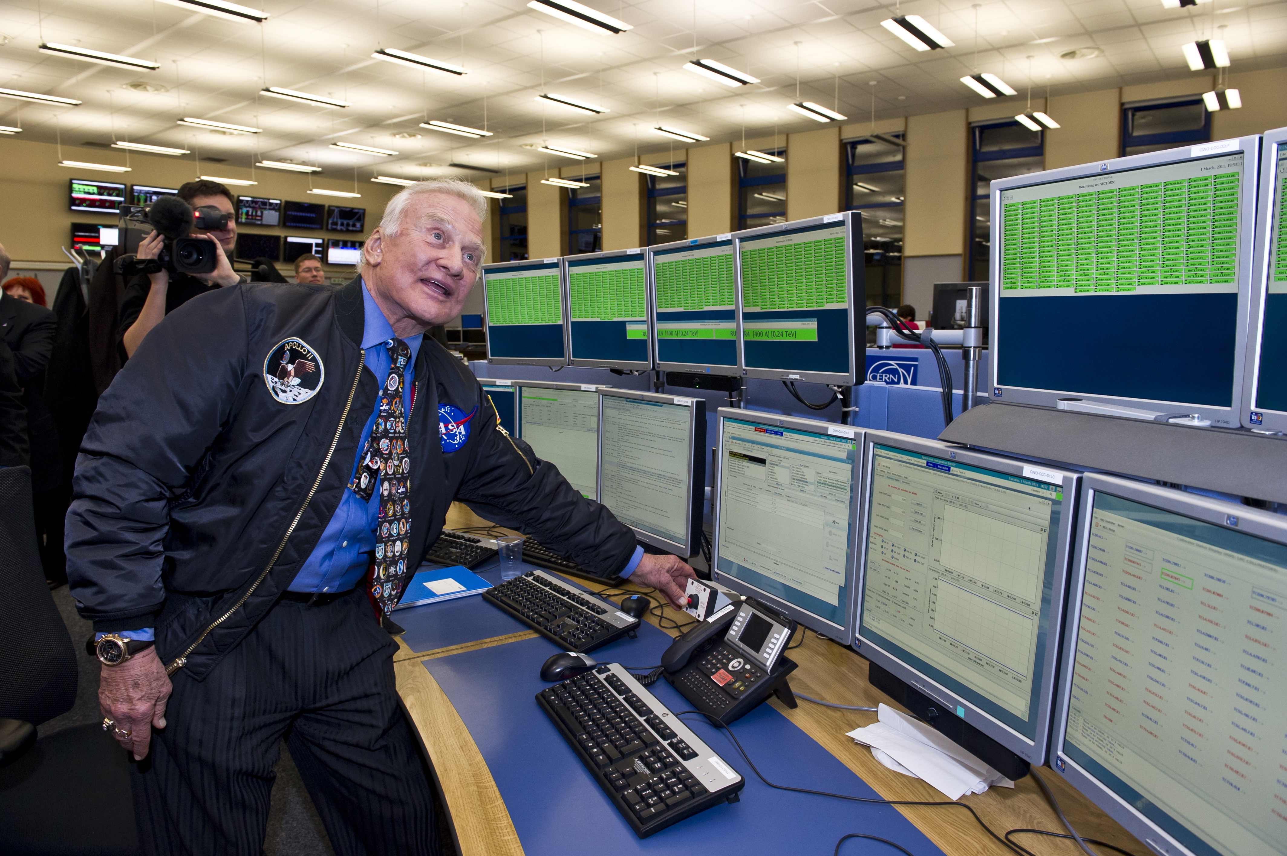 La visite de l’astronaute s’est terminée par une halte au Centre de contrôle du CERN, où l’équipe du LHC lui avait réservé un accueil tout particulier. Là, il a été reçu par Mike Lamont, chef du groupe Opérations du département Faisceaux, qui lui a fait découvrir les coulisses de l’exploitation des accélérateurs. Les regards se sont ensuite rivés sur lui, lorsque, attentif, il a actionné le système d’arrêt des faisceaux pilotes qui circulaient dans la machine. Les applaudissements ont retenti dans le centre de contrôle ; une opération courante était devenue un événement scientifique inoubliable ! « Buzz est le symbôle d'un très grande réussite de l'humanité, a déclaré Mike Lamont. De le voir ici, tout comme la photo de son empreinte de pas à la surface de la Lune, nous rappelle à quel point l'alunissage fut un événement marquant. »